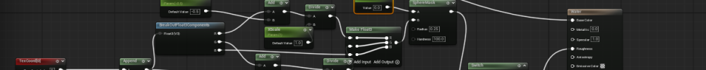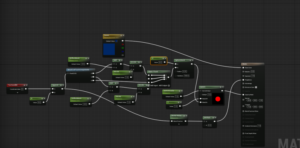 Essentially its just a blue matte material with a sphere mask. The sphere mask just tells unreal what to make translucent instead of blue. Going back to my last game post (the one about how compiling materials is horrible). I made a generic rain material instance where I parameterized the rain settings: