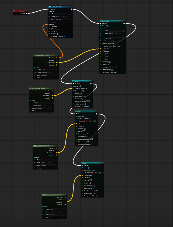 This segment is the forward solve section where IK is applied to each limb. Honestly not that bad to make but the mental gymnastics I was doing to basically say “hey this easy thing (modular rigs) should be easy” made me rip my hair out for a few hours.